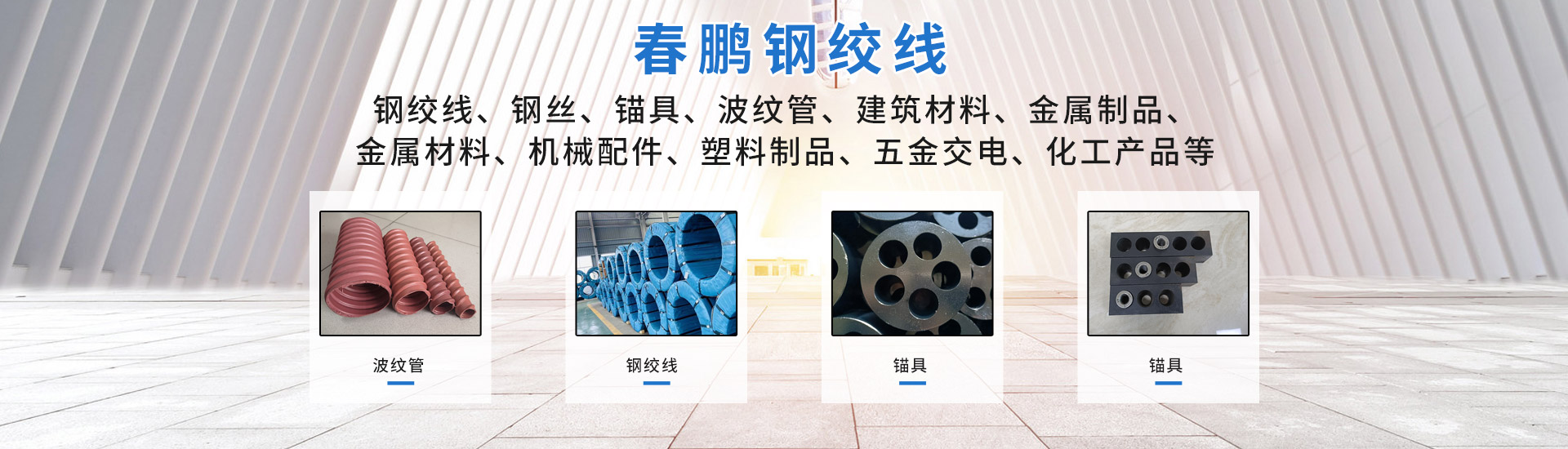 公司主营产品:钢绞线、预应力钢绞线、钢丝、锚具、波纹管、建筑材料、金属材料等产品专业生产销售公司,拥有完整、科学的质量管理体系。天津市春鹏伟业商贸有限公司以诚信、实力和产品质量获得业界的认可。欢迎各界朋友莅临参观、指导和业务洽谈。